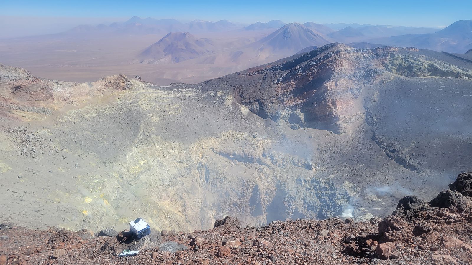 Water vapor camera set up at the edge of the crater at Volcán Lascar - Atacama Desert, Chile